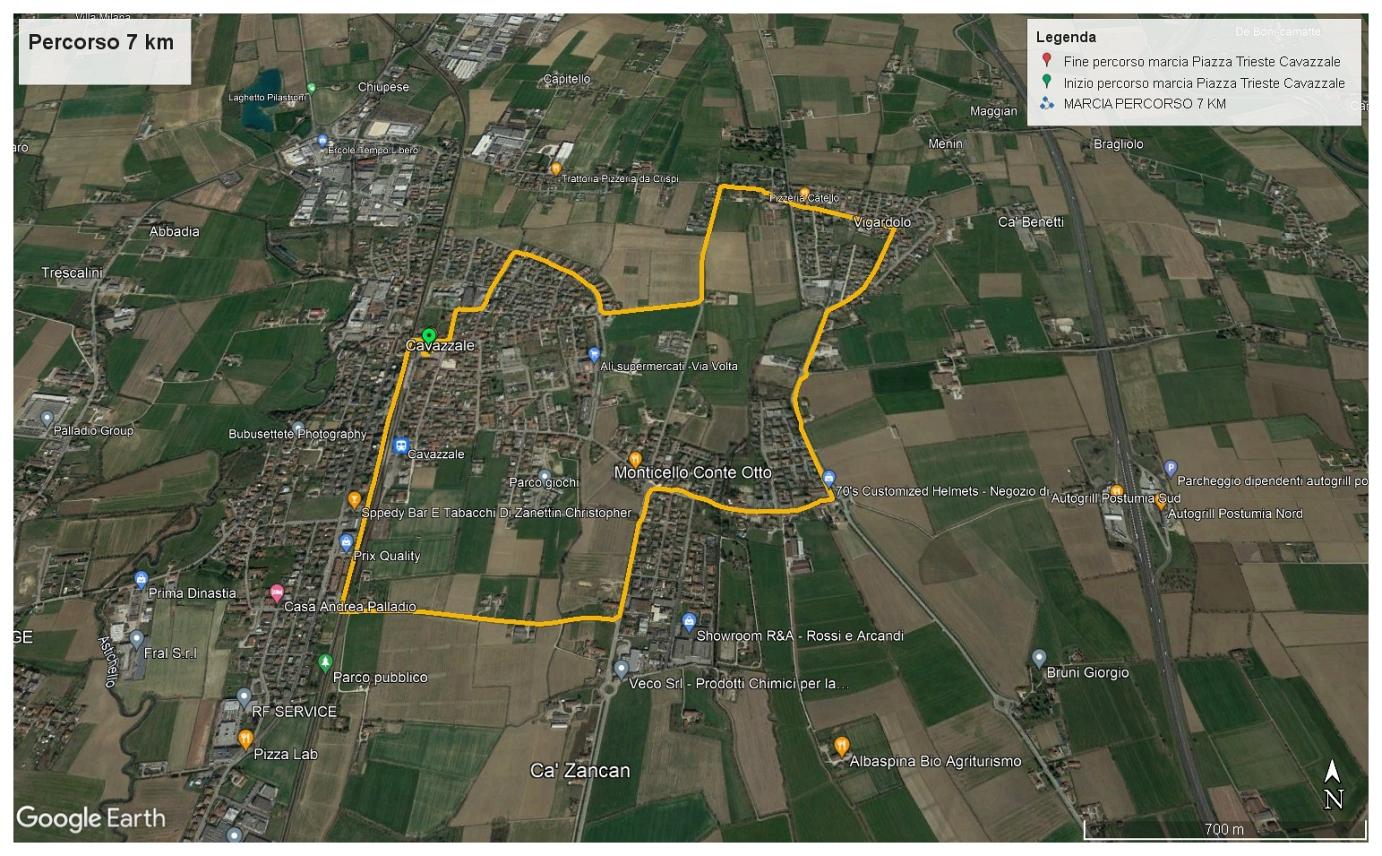 🏃 Percorso da 7 km – Ideale per chi desidera attraversare i tre paesi del Comune di Monticello Conte Otto: Cavazzale, Monticello Conte Otto e Vigardolo.